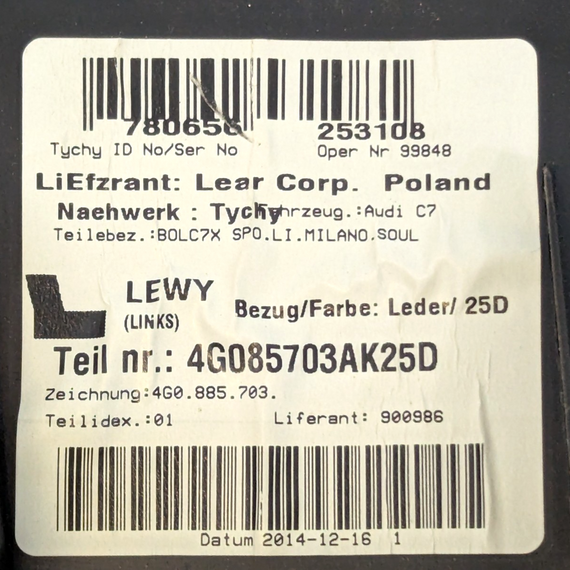 12-18 AUDI A6 C7 OEM REAR SEAT BOLSTER SIDE LEFT PASSENGER 4G085703